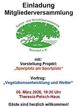 Was wäre ein Großprojekt ohne einen „Spatenstich“! Aus diesem Grund laden wir dazu alle Bernriederinnen und Bernrieder recht herzlich am Sonntag, 22. März, um 14 Uhr zum Sportgelände ein. In gemütlicher Atmosphäre bei Kaffee und Kuchen möchten wir gemeinsam den Startschuss feiern, noch einmal ausführlich über den „Spielplatz am Sportplatz“ informieren und eure Fragen beantworten (bei schlechtem Wetter treffen wir uns im Vereinsheim).